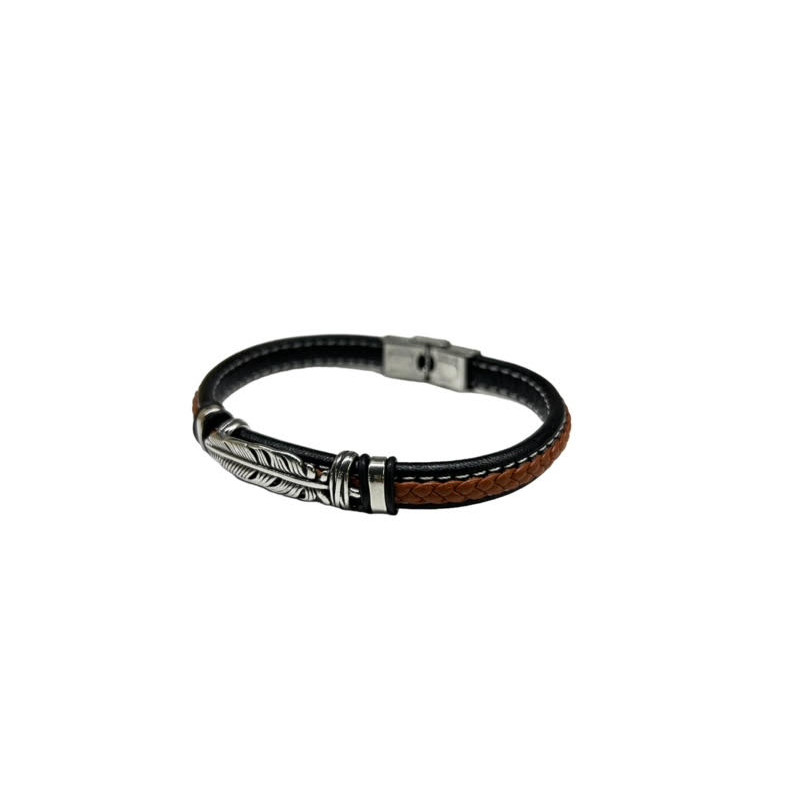 • Pulsera acero con pluma y correa de color marrón clarol.