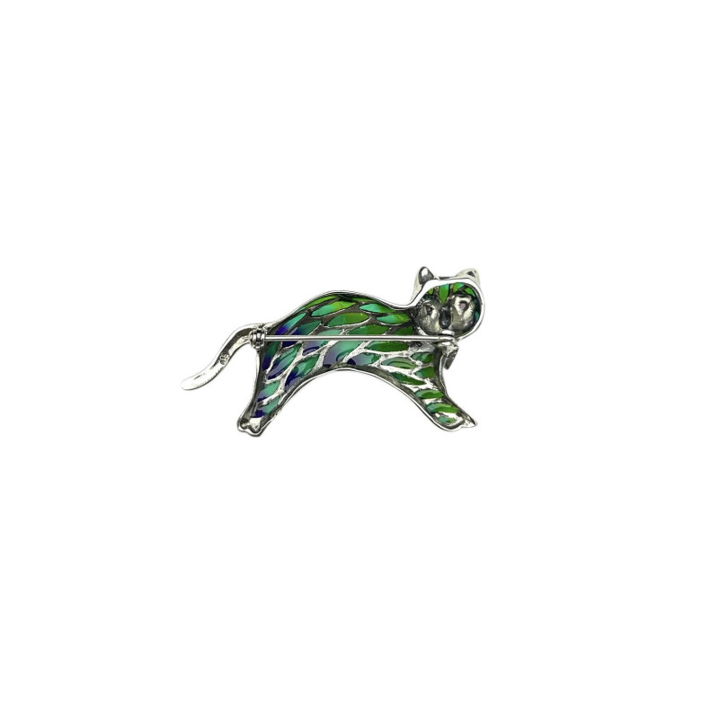 • Broche en forma de gato con esmalte en tonos verdes, marauesitas y Plata 925.