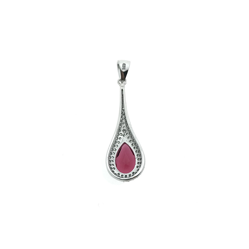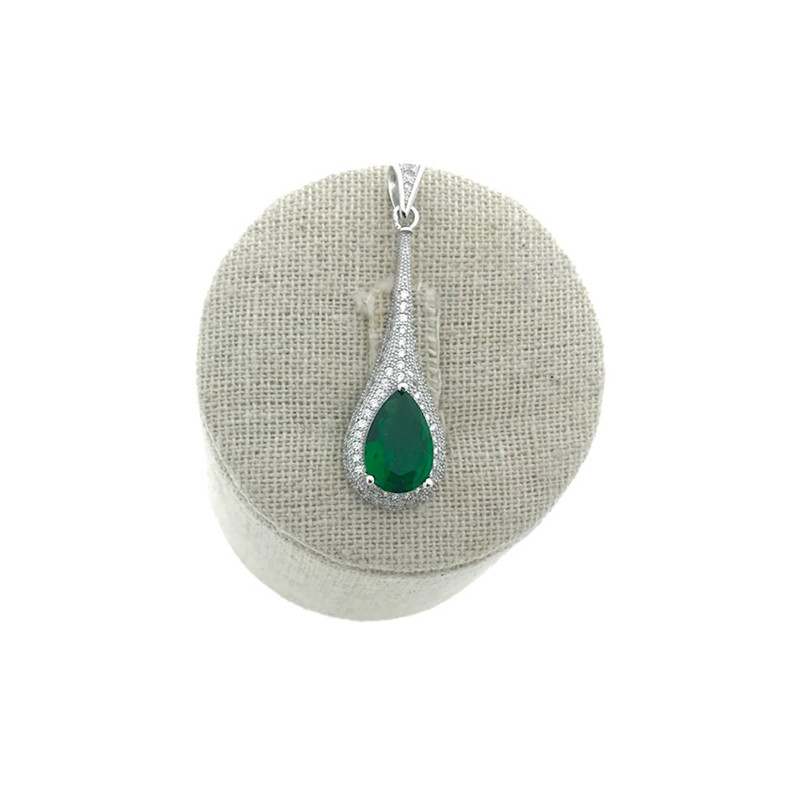 • Colgante en forma de lágrima con una circonita en verde rodeado de circonitas pequeñas blancas.