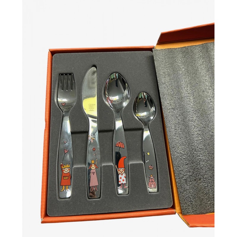 • Cubiertos en acero inoxidable compuestos por cuchara, tenedor, cuchillo y cuchara de postre con dibujos.