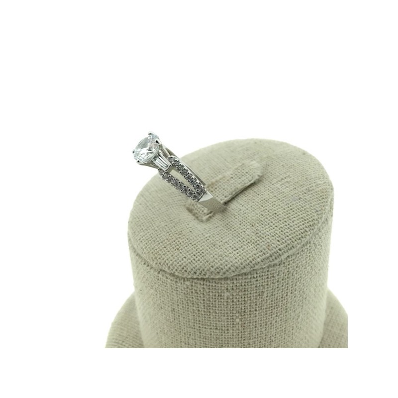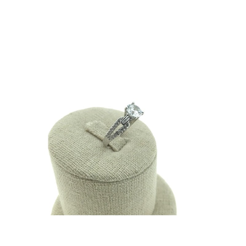 • Sortija en plata 925 con una circonita de 4 patillas y varias circonitas mas pequeñas en los brazos de la sortija.