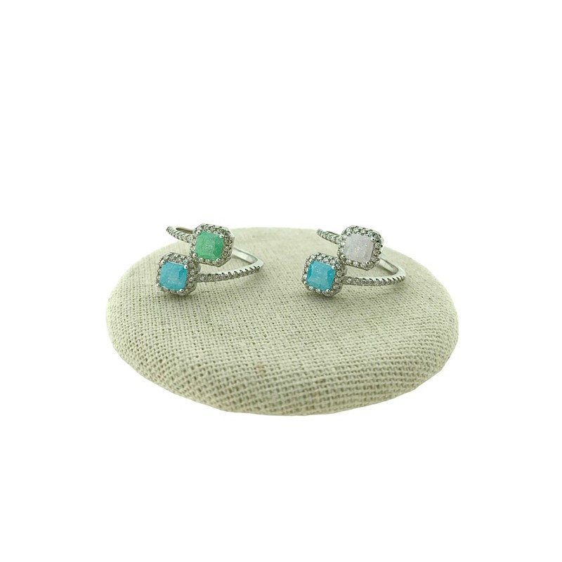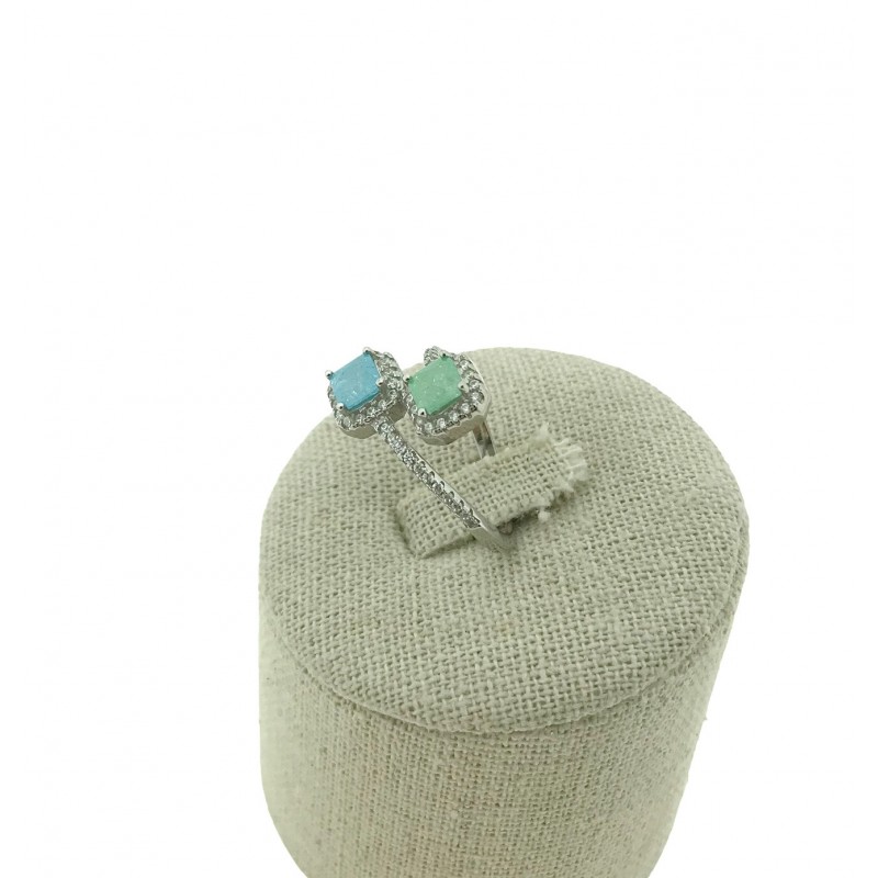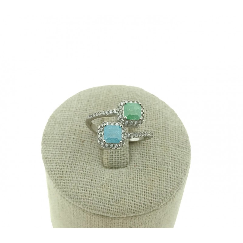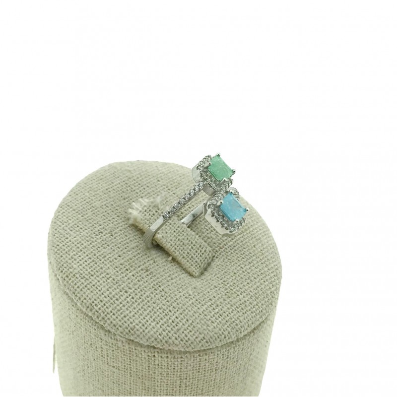 • Sortija plata y circonitas en color verde y azul y circonitas pequeñas de color blanco, todo montado en plata 925.